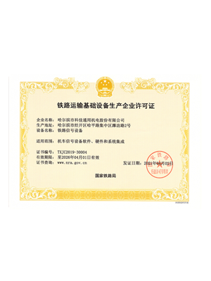 獲得國家鐵路局頒發(fā)“鐵路運輸基礎設備(機車信號)生產企業(yè)”行 政許可證書